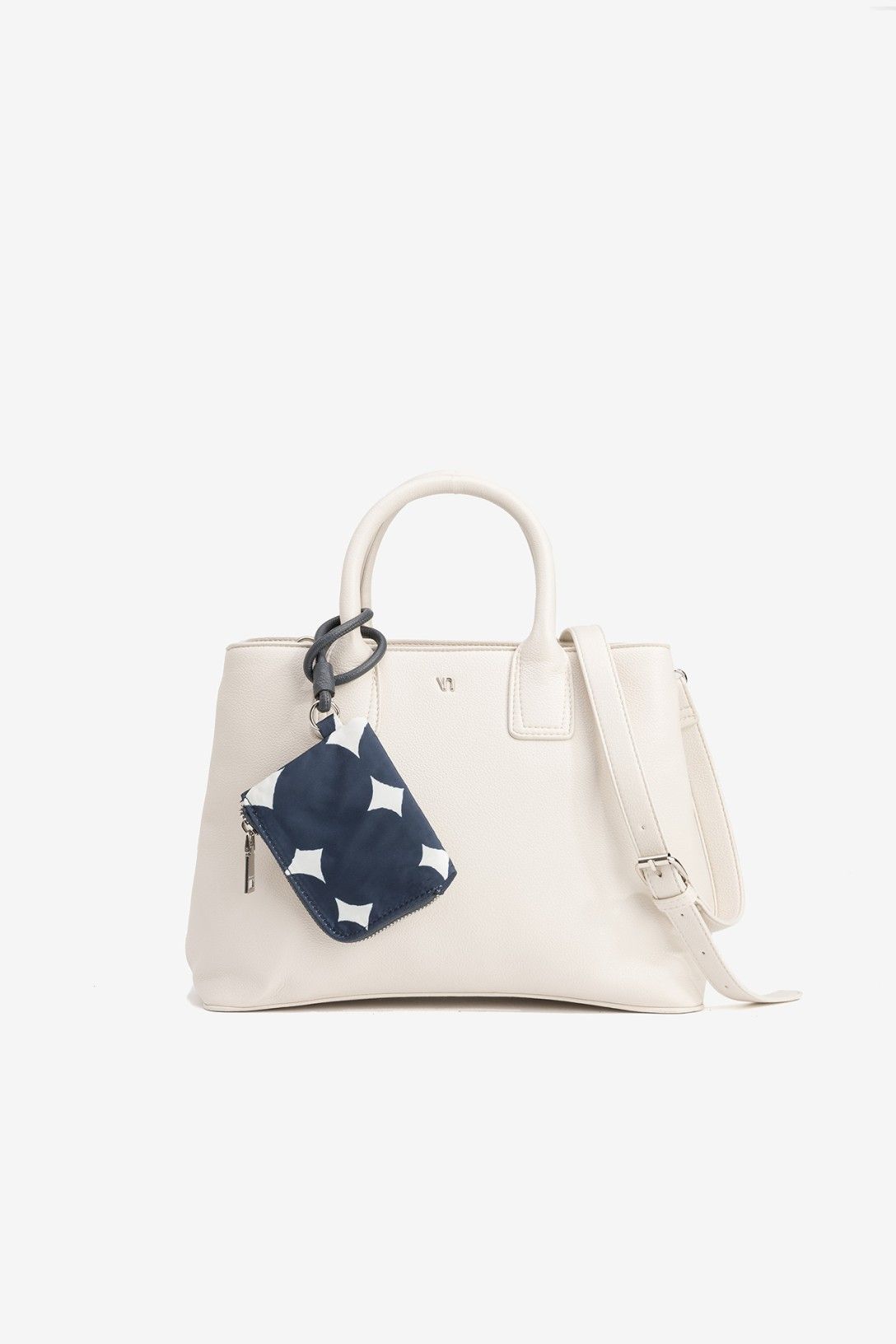 Bolso city efecto piel con dos compartimentos, cierres superiores de cremallera y bolsita extraíble de nailon estampado. Asas de mano fijas y correa de hombro ajustable y extraíble. Bolsillo interior con cierre de cremallera. Tamaño mediano.