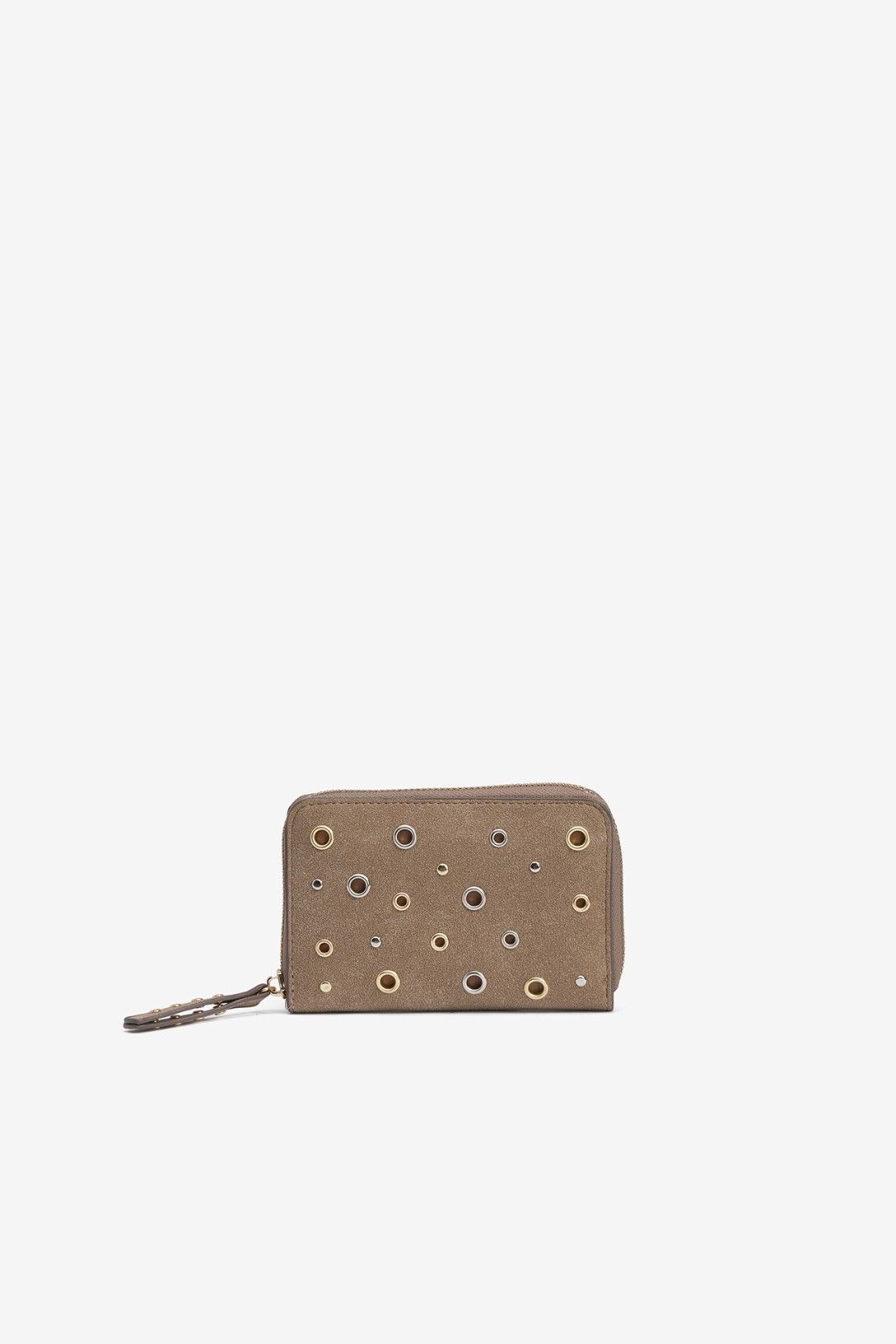 Monedero efecto ante con ojales metálicos y cierre de cremallera. Interior con siete compartimentos para tarjetas, dos compartimentos para billetes y un bolsillo con cierre de cremallera. Tamaño mediano. Dimensiones: 13,5 x 9,5 x 2 cm.
