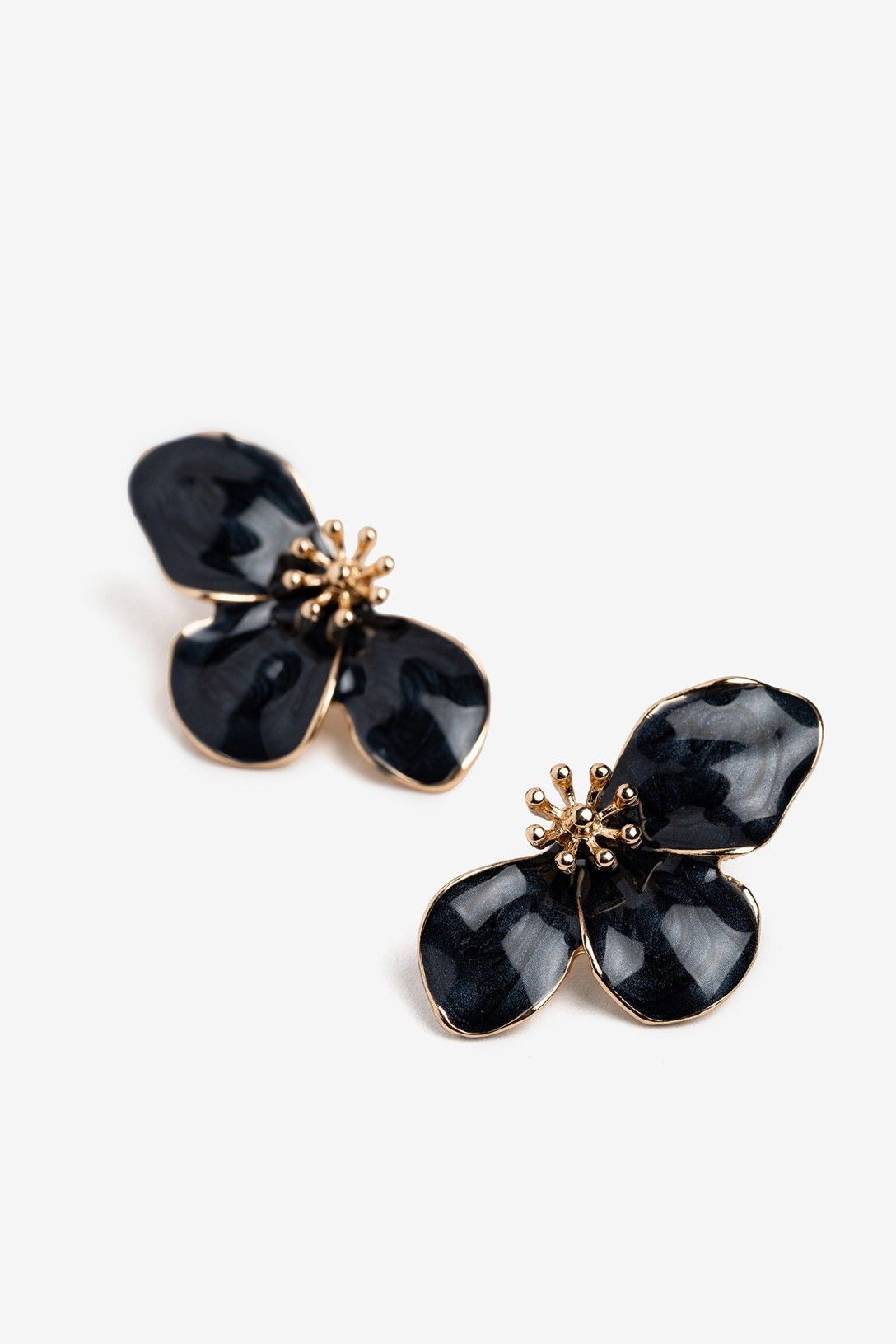 Pendientes con pétalos azul marino y detalles dorados en el centro, diseño elegante y moderno.